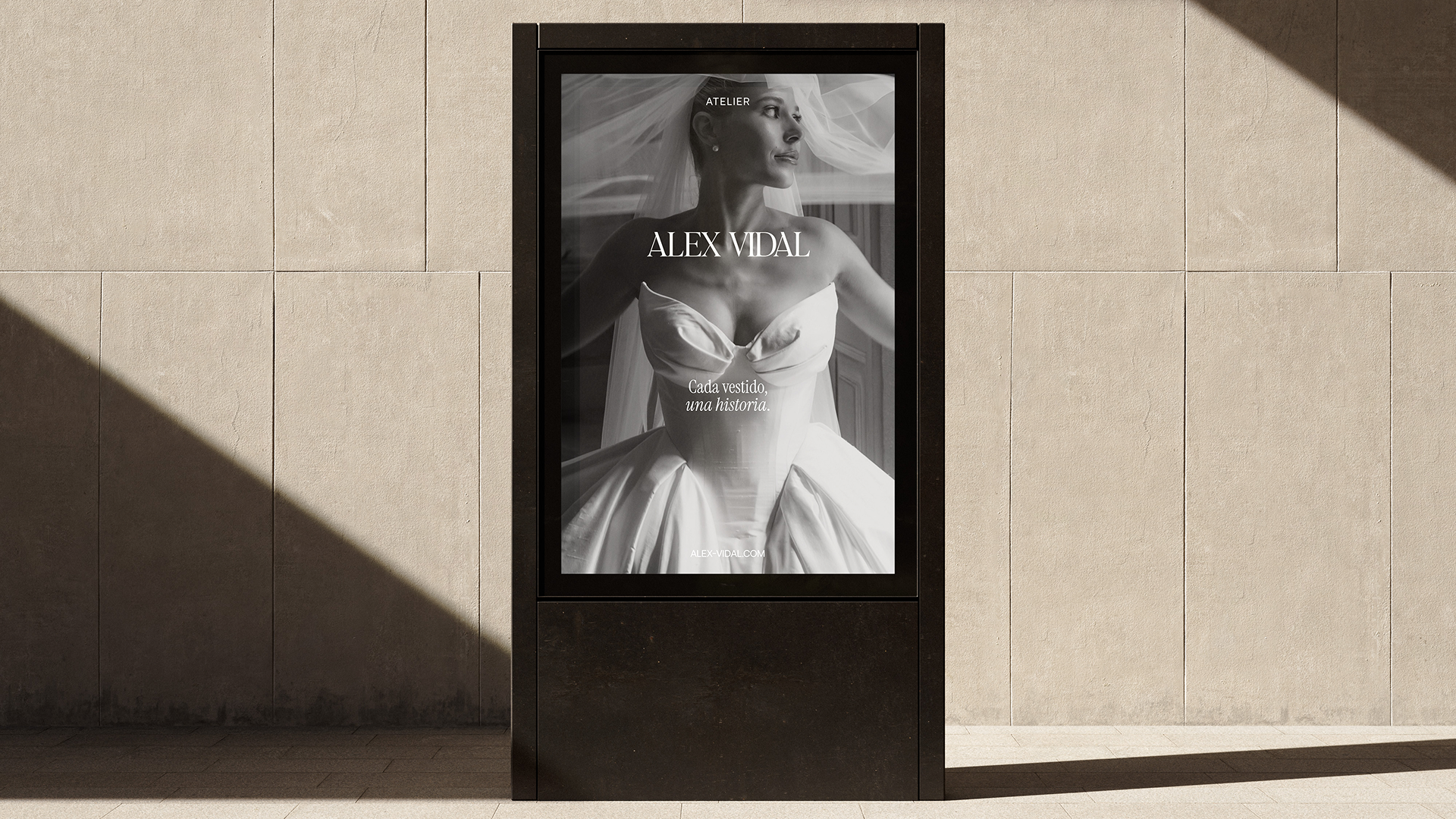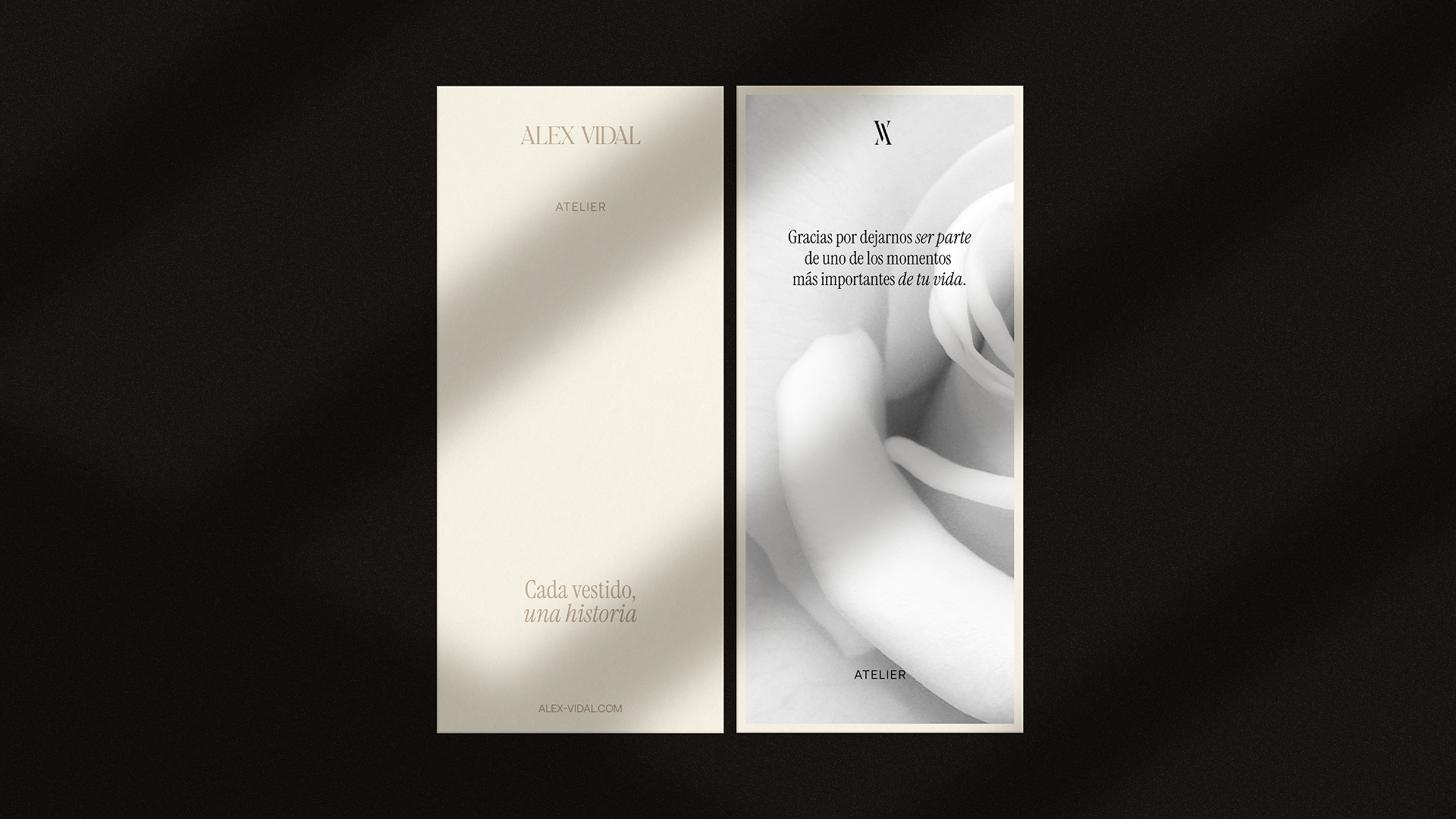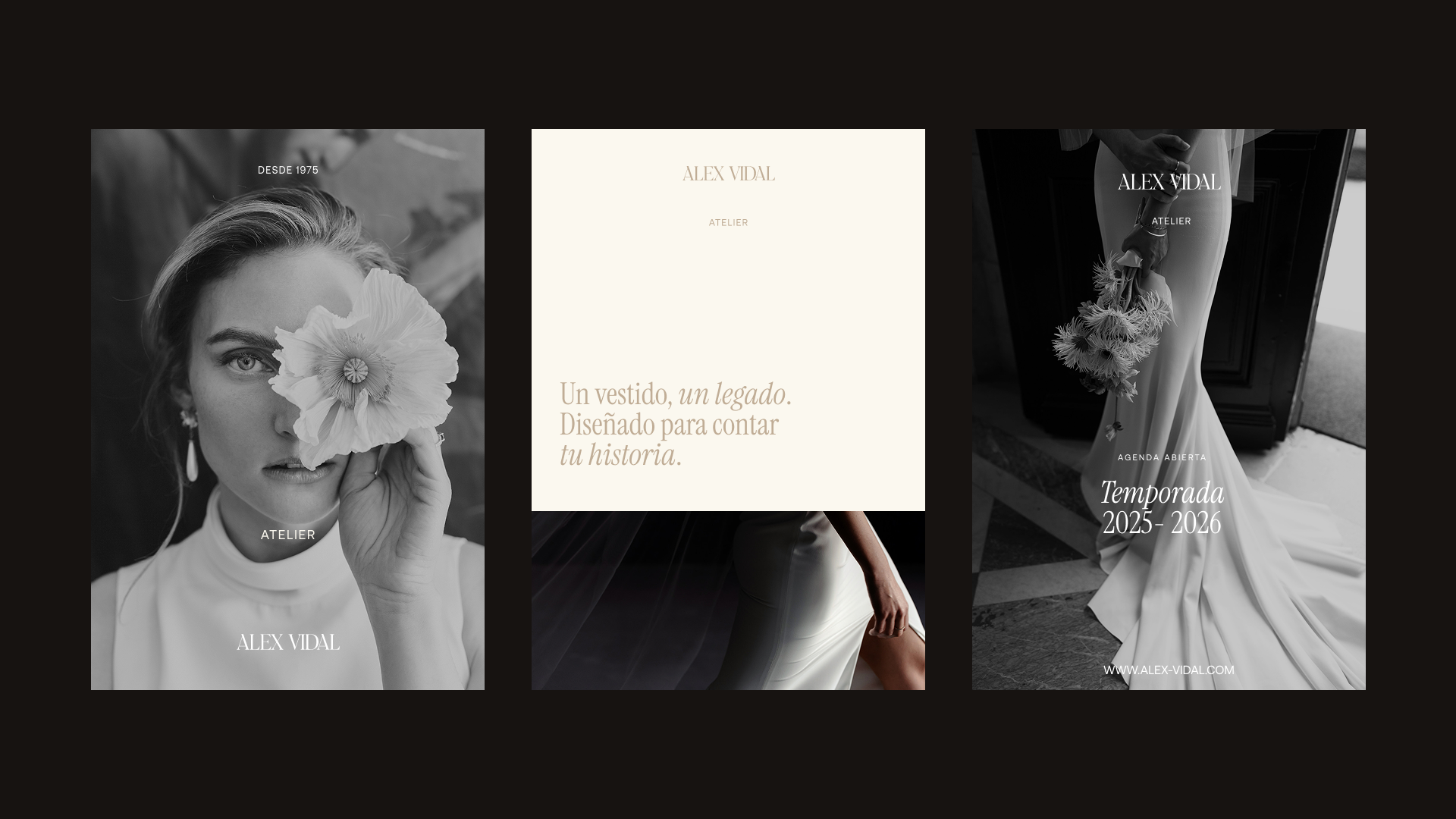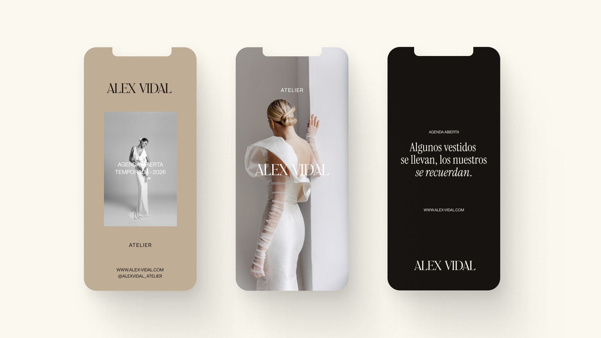 El objetivo fue transmitir confianza, elegancia y sensibilidad, valores fundamentales en la relación con cada novia. Otro aspecto clave fue asegurar coherencia en todos los puntos de contacto, logrando una presencia sólida y atemporal tanto en el entorno digital como en el físico, que inspira seguridad y refleja la experiencia y el cuidado artesanal que caracterizan a Alex Vidal Atelier.