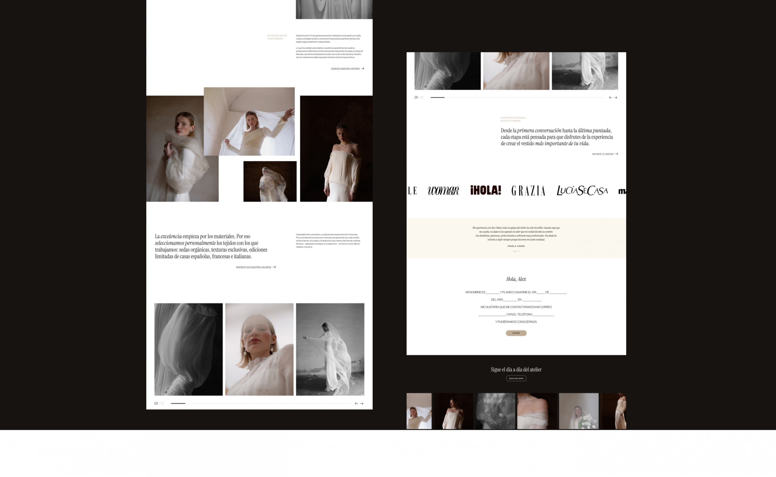 Para el sitio web del atelier, buscamos mantener un diseño limpio y elegante mientras incorporábamos elementos visuales personalizados que reflejan la esencia de cada novia. Estas piezas dinámicas simbolizan la unión de tradición artesanal, creatividad y la emoción única de cada historia nupcial.
